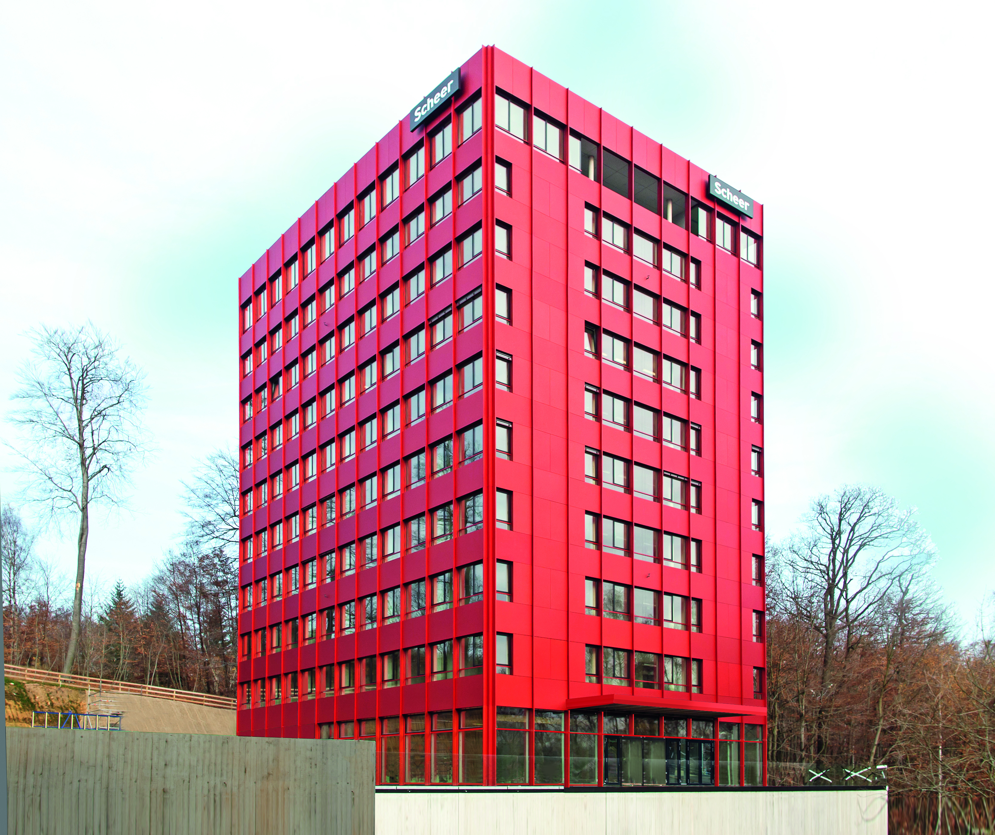 Am Rande des Nord-Campus der Universität des Saarlandes wurde im Januar 2013 eines von drei geplanten Hochhäusern in Nutzung genommen. Das Gebäude wird unter der Bezeichnung Scheer-Tower Bürogebäude genutzt und erstreckt sich über 11 Geschosse. Die Abmessungen des Erdgeschoßes und der Obergeschoße betragen 27,8 m x 21,0 m. Das Untergeschoß ist als Sockelgeschoß gegenüber den aufgehenden Ebenen um ca. 6m verlängert. Das Tragwerk des Gebäudes besteht aus einem Stahlbetonskelett. Die Aussteifung erfolgt über den Erschließungskern. Aufgrund der sehr guten Baugrundverhältnisse konnte das Gebäude auf Einzel- und Streifendfundamenten gegründet werden. Das Gebäude ist das erste saarländische Bauwerk, welches nach der seit 26. Januar 2011 geltenden Hochhausverordnung geplant wurde. Alle tragenden Bauteile gewährleisten einen Feuerwiderstand F90.